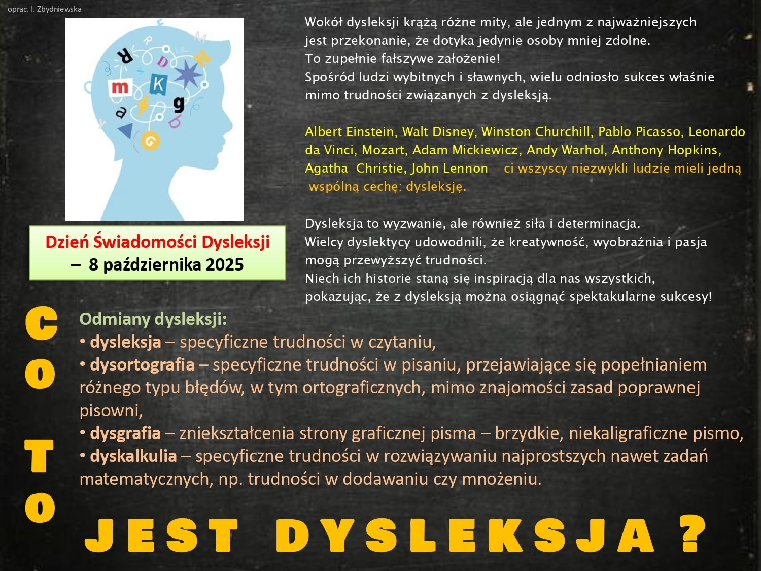 Dzień 8 października, zgodnie z ustaleniami Europejskiego Towarzystwa Dysleksji, jest szczególnie wyróżniony jako Dzień Świadomości Dysleksji - #dyslexiaday.Zamieszczamy tematyczne materiały edukacyjne i informacyjne, przygotowane przez nauczycieli i specjalistów.